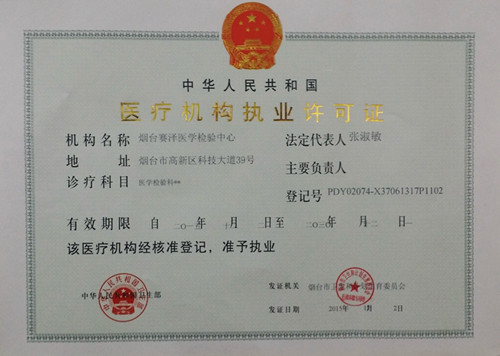 2015年12月2日,落戶于山東國際生物科技園的煙臺市首家從事第三方醫(yī)學(xué)檢驗(yàn)的“獨(dú)立醫(yī)學(xué)實(shí)驗(yàn)室”—煙臺賽澤醫(yī)學(xué)檢驗(yàn)中心正式通過煙臺市衛(wèi)計委組織的專家和行政執(zhí)法人員現(xiàn)場審核驗(yàn)收和意見答復(fù)審核,獲得煙臺市衛(wèi)計委頒發(fā)的《醫(yī)療機(jī)構(gòu)執(zhí)業(yè)許可證》,可以正式開展對外醫(yī)學(xué)檢驗(yàn)服務(wù),成為煙臺首家正式對外運(yùn)營的第三方醫(yī)學(xué)檢驗(yàn)中心。